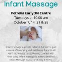 Families with infants 1 to 8 months are welcome to join this 4-week program. Parents will learn techniques to soothe and connect with their baby. Infant massage can help aid with sleep, colic and indigestion for your child. Registration is required by calling 519-882-2100 or emailing EarlyON@nlchildcare.ca Petrolia EarlyON Centre – 4141 Dufferin Ave.