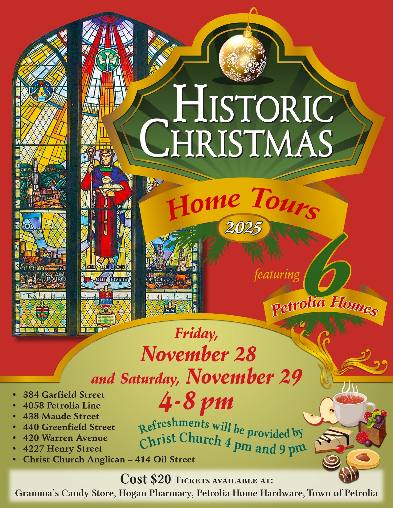 « All Events Victorian Christmas and Home Tour November 29 @ 4:00 pm - 8:00 pm|Recurring Event (See all)One event on November 29, 2025 at 4:00 pm « Starbright Christmas Starbright Christmas » + Google Calendar+ iCal Export Details Date: November 29 Time: 4:00 pm - 8:00 pm Website: https://www.facebook.com/profile.php?id=100085317562225 Organizer Christ Church Anglican Website: https://www.facebook.com/profile.php?id=100085317562225 Venue Christ Church Anglican 414 Oil Street Petrolia, Ontario N0N1R0 Canada + Google Map