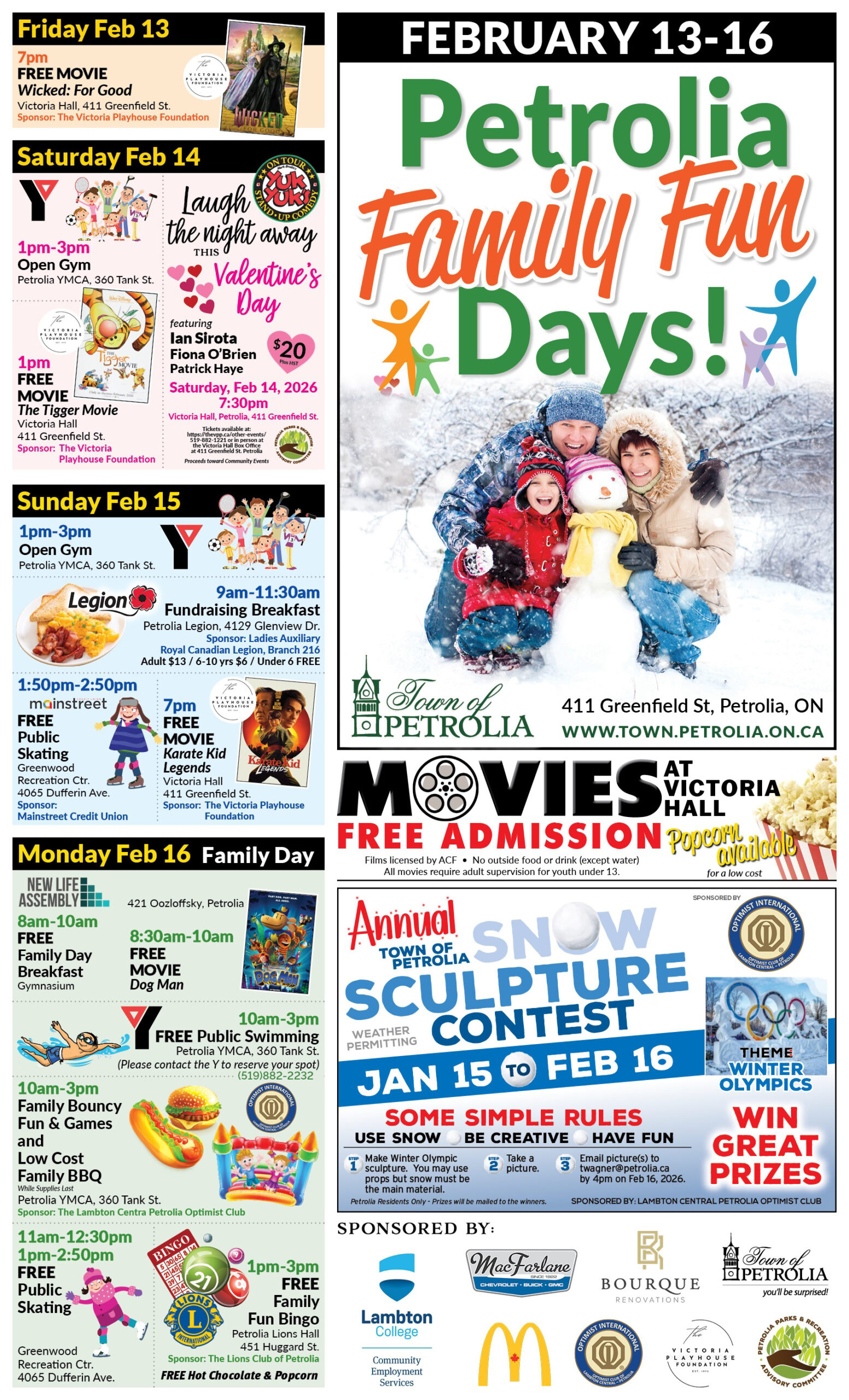 Victoria Hall 411 Greenfield Street, Petrolia, ON, CanadaPETROLIA FAMILY FUN DAYS PROMISE FUN FOR THE WHOLE FAMILY! Petrolia – February in Petrolia means two things: family and fun! Events are planned throughout Petrolia February 13-16, 2026. The fun starts at Victoria Hall on Friday, February 13, with a FREE Family Movie sponsored by The Victoria Playhouse Petrolia Foundation. “WICKED: FOR GOOD” (PG)... Read more »